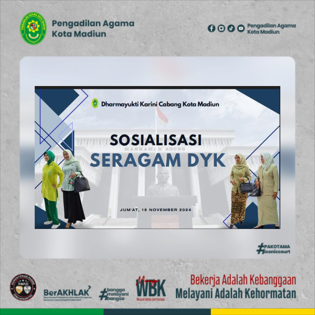 Acara dilanjutkan sosialisasi mengenai seragam Dharmayukti Karini oleh Ummi Jihadah Safi’I, S.Psi. selaku Seksi Organisasi memaparkan terkait Seragam Dharmayukti Karini Cabang Kota Madiun yang dipakai berdasarkan: Buku Pedoman Organisasi dan Administrasi Dharmayukti Karini Masa Bakti 2022-2025, diantaranya: 1) Seragam Resmi Blazer Terdiri dari 3 bagian yaitu: Bagian Atas, Blazer (Lengan Panjang menggunakan Kancing Bungkus Besar sebanyak 2 buah dibagian depan blazer dan 3 buah kancing bungkus kecil dibagian lengan, panjang Blazer 10- 15cm dibawah pinggul besar); Bagian Bawah: Rok Span (panjang rok sampai diatas mata kaki dengan ploi tertutup dan split tumpuk); Blouse: Lengan Pendek (leher bulat baby, berlengan pendek/ leher sanghai bagi yang berbusana muslim). Adapun Kelengkapannya, yaitu: Tas warna hitam (pengadaan oleh Pengurus Pusat); Sepatu Hitam model tertutup dengan tinggi hak 3.5 cm s/d 5 cm, Lencana: dipasang dibagian kiri kerah blazer, Aksesoris: 1 cincin, jam tangan dan sepasang anting Kerudung persegi empat warna selaras dengan warna hijau pupus dapat digunakan sampai menutup dada diberi lambang Dharmayukti Karini disalah satu sudut kerudung pengadaan oleh pengurus pusat. Penggunaan Seragam Resmi Blazer: Menghadiri acara resmi, antara lain: Acara Peringatan HUT DYK, Upacara Bendera dalam memperingati Hari Besar Nasional Pelantikan Pengurus Dharmayukti Karini dan Acara MUNAS, MUSDA dan MUSCAB, Mewakili Dharmayukti Karini yang ketentuannya harus memakai seragam resmi (sesuai undangan).