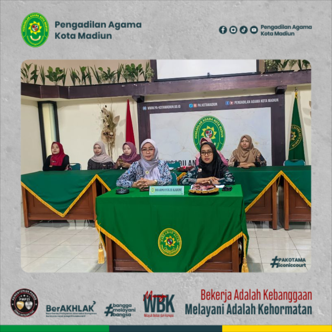 Wakil Ketua I Dharmayukti Karini (DYK) Cabang Kota Madiun Hj. Alvia Agustina Rahmah Zefri, S.H. dan Ummi Jihadah Safi’I, S.Psi. bersama anggota DYK PA Kota Madiun menghadiri Pertemuan rutin Dharmayukti Karini Cabang Kota Madiun secara virtual melalui aplikasi zoom meeting pada Jum’at, (15/11/2024). Dalam kesempatan ini Wakil Ketua I Dharmayukti Karini (DYK) Cabang Kota Madiun Hj. Alvia Agustina Rahmah Zefri, S.H. mengikuti zoom meeting di satker tempat dinas, sementera itu Ummi Jihadah Safi’I, S.Psi., serta anggota DYK PA Kota Madiun mengikuti di Aula PA Kota Madiun.