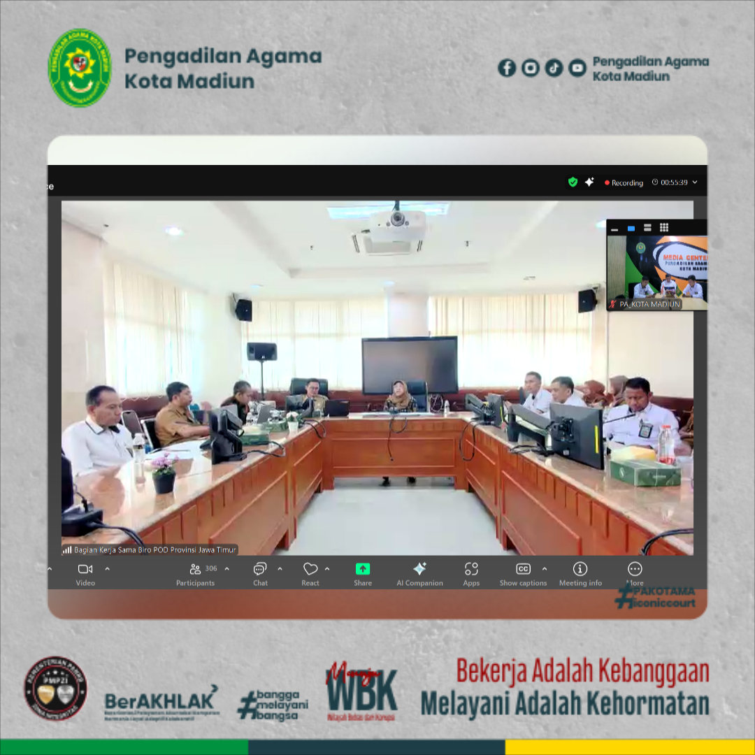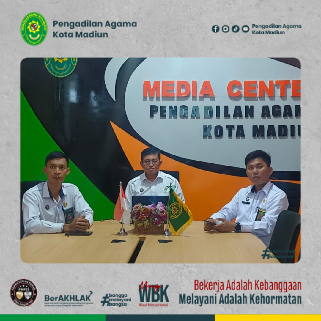 Ketua PA Kota Madiun Dr. H. Sofyan Zefri, S.H.I., M.S.I. bersama Panitera Lucky Aziz Hakim, S.H.I., M.H. dan Sekretaris Onis Nur Islahi, S.Sos., M.M. menghadiri Rapat Sosialisasi dan Fasilitasi Sinergi Program upaya Perlindungan Perempuan dan Anak Pemerintah Provinsi Jawa Timur dengan Pengadilan Agama se- Jawa Timur secara daring di media center PA Kota Madiun melalui zoom meeting pada Senin, (28/7/2025).